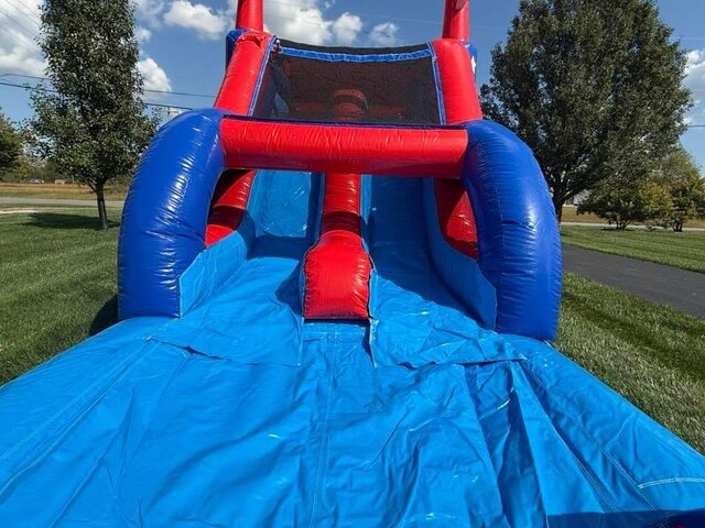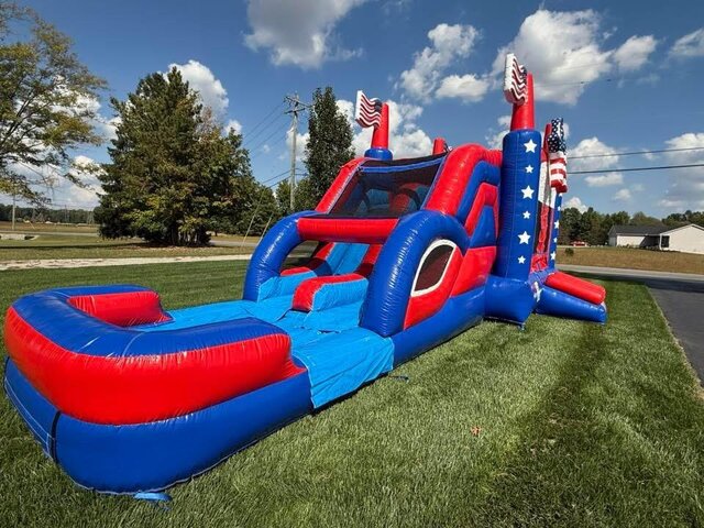 Get ready for hours of non-stop fun with the Patriot Bounce House Combo—a vibrant and exciting inflatable perfect for birthday parties, school events, and backyard celebrations. Step inside the spacious bounce house to jump, bounce, and shoot hoops with the built-in basketball goal. Then climb the rock wall and race down the double lane dry slide for a thrilling finish, safely landing on the cushioned stopper at the bottom—no water needed!